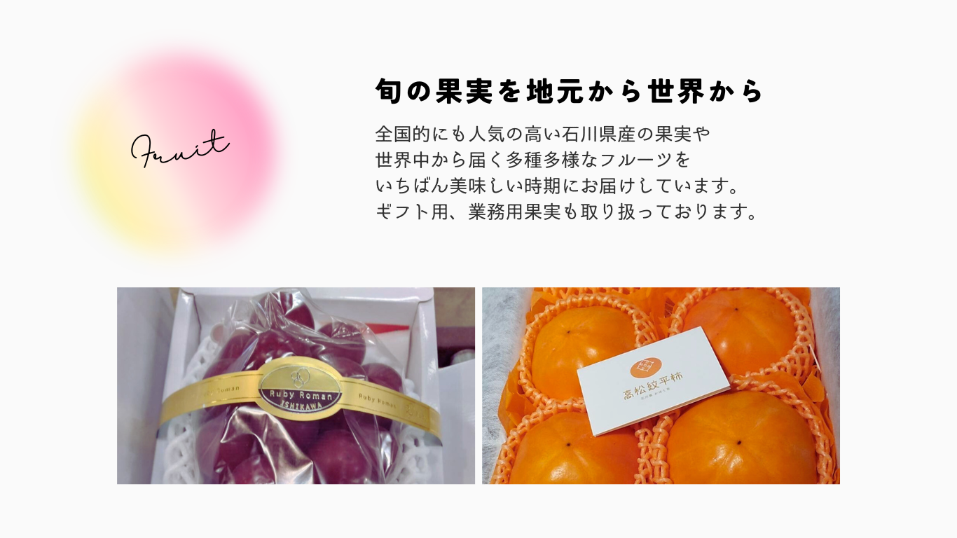 加賀野菜、能登野菜、促成野菜や業務用果実、贈答用フルーツなどたくさんの商品を取り扱っています。プロの目利き人が選んだ旬の食材が揃います。